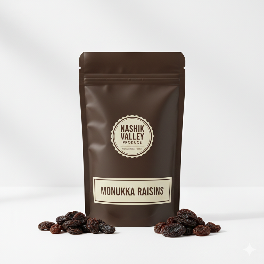 Monukka Raisins are larger and darker than regular raisins, offering an intense sweetness with a slightly tangy finish. Their chewy texture and strong flavor make them stand out in both taste and appearance.